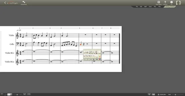 Erste Schritte: Um Noteflight verwenden zu können, müssen Sie ein Nutzerkonto erstellen. Auf Ihrem Homescreen finden Sie die bisher gespeicherten Partituren. Am oberen Rand befindet sich die Navigation. Die Steuerung innerhalb der Notenansicht funktioniert hauptsächlich mit der Maus. Eine Liste mit Tastaturbefehlen ist auf der Webseite verfügbar. Jedes Instrument und jeder Takt wird mit einem grauen Balken abgetrennt. Das Pluszeichen daneben erstellt jeweils ein neues Element. Noten werden per Mausklick am richtigen Ort platziert und danach mit einem Menü bearbeitet.