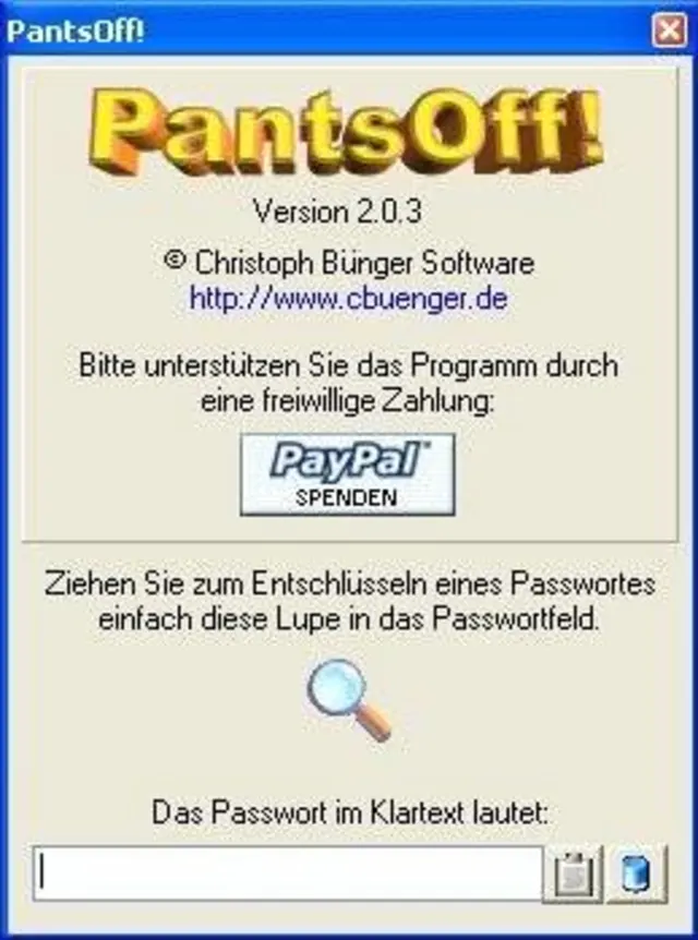 Quelle: PCtipp.chDoch ein nur einmal eingegebenes Passwort vergisst man leicht, und dann ist in vielen Programmen das Passwort zwar gespeichert, aber aus Sicherheitsgründen nicht mehr sichtbar. Es wird nur noch in Form von Punkten oder Sternchen angezeigt. Einen Ausweg bietet hier PantsOff von Christoph Buenger . Indem Sie eine Lupe in irgend ein Passwortfeld ziehen, sehen Sie die verdeckten Buchstaben im Klartext und erhalten so Ihr Passwort zurück.