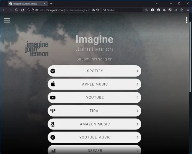Nach ein paar Sekunden wird die Landing-Page erstellt. Kopieren Sie den Link aus der Browser-Adresszeile, in unserem Beispiel ist es etwa dieser: https://songwhip.com/john-lennon/imagine1971. Wer draufklickt, findet sich auf der Songwhip-Seite wieder, mit Links zum Stück oder Album bei Spotify, Apple Music, YouTube (sowie YouTube Music), Tidal, Amazon Music, Deezer oder Qobuz.