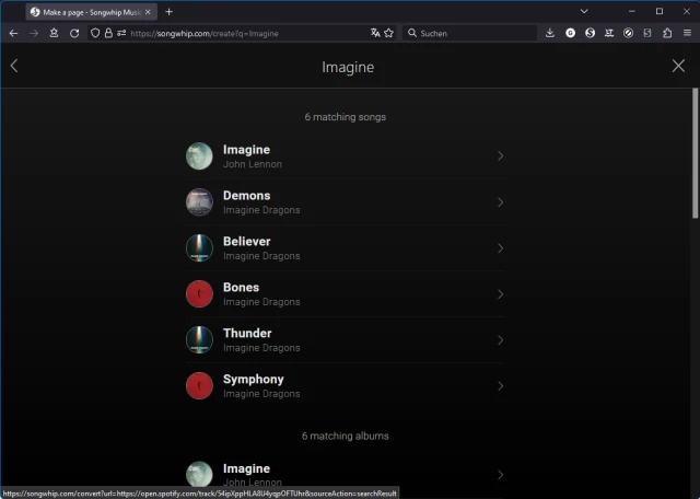 So gehts: Surfen Sie zu Songwhip.com und klicken Sie auf den grossen roten Button Make a Music Link. Im Suchfeld («Search or paste a link») tippen Sie den Bandnamen oder den Titel des Musikstücks ein, zum Beispiel Imagine. Alternativ können Sie Ihren Spotify- oder sonstigen Musiklink dort einfügen. Wählen Sie den Titel aus.