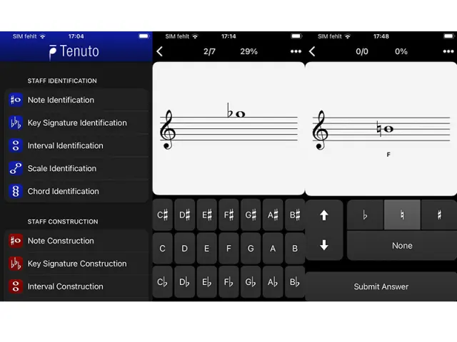 Wählen Sie unter Staff identification die Funktion Note Identification. Sie sehen nun die fünf Notenlinien, links den Violinschlüssel und an beliebiger Stelle eine Note (z. B. eine Viertelnote) vor sich. Hierdurch soll die Notenhöhe bzw. das Erkennen einer Note geübt werden. Unterhalb der Notenlinien haben Sie verschiedene Töne zur Auswahl (z. B. C, C♯ oder C♭. Wenn Sie auf die richtige Note tippen, erklingt der entsprechende Ton und die nächste Aufgabe folgt. Falls nicht, können Sie sich via Drei-Punkte-Symbol die Lösung anzeigen lassen (Reveal Answer).