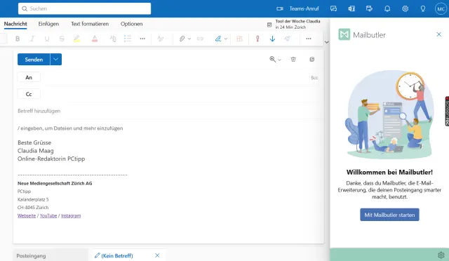 Surfen Sie auf diese Seite und wählen Sie den richtigen E-Mail-Client aus (es gibt ihn auch für Apple Mail und Gmail). Klicken Sie auf Go to App Source. Oben rechts können Sie Land und Sprache ändern. Klicken Sie auf Apply statt Get it Now, sehen Sie nun den Button Jetzt abrufen. Klicken Sie darauf. Folgen Sie der Anleitung auf dem Bildschirm. Sie werden gebeten, sich mit Ihrem Business-Microsoft-Account anzumelden und Sie müssen das Herunterladen noch einmal manuell bestätigen. Anschliessend können Sie das Mailbutler-Add-in Outlook für Web öffnen. Um es zu finden, klicken Sie auf Neue E-Mail, danach finden Sie Mailbutler via Drei-Punkte-Icon. Klicken Sie dort rechts auf Mit Mailbutler starten und folgen Sie den Anleitungen.