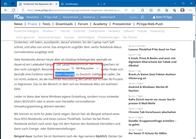Wenn Sie im Edge-Webbrowser etwas Text markieren, erscheint jedes Mal automatisch der Befehl «Mit Bing suchen». Falls Sie eine andere Suchmaschine benutzen, kann das Minimenü weg.