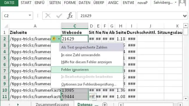 Obwohl Sie Ihre importierte Spalte «Artikel-Nummer» ganz bewusst als Text formatieren wollten, meint Excel, es hätte diese lieber als Zahlen. Wie bekommen Sie die grünen Fehlerdreiecke weg?