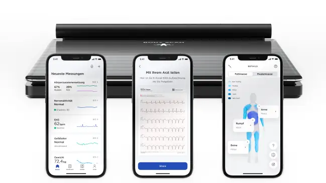 Body Scan liefert nicht nur Indikatoren für die Körperzusammensetzung wie Muskel-, Knochen- und Fettmasse. Sie nimmt auch kardiovaskuläre Messungen wie 6-Kanal-EKG oder Herzfrequenz vor. So koppeln Sie die Waage mit der App.