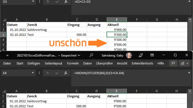 Wenn Sie in Ihrem Excel-Kassenbuch die Saldo-Formel herunterziehen, steht entweder dutzendfach der aktuelle Kontostand drin oder dann ein Nullbetrag. Beides ist unschön, lässt sich aber mit einem cleveren Zellformat beheben.