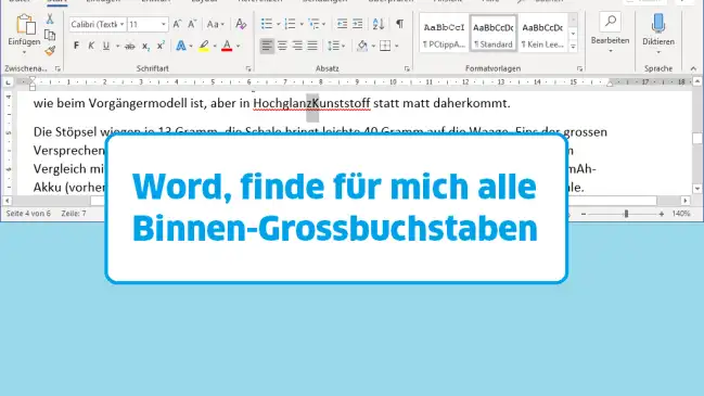 Beim Importieren eines Textes sind Bindestriche verloren gegangen. Nun soll Word für Sie nach «Binnen-Grossbuchstaben» fahnden; also Grossbuchstaben, die mitten in einem Wort stehen. Das geht sehr einfach und nicht nur in Word.