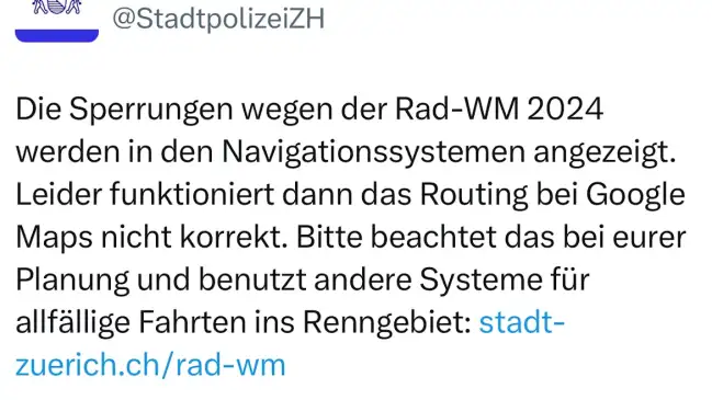 Stadtpolizei Zürich rät bei Rad-WM von Google Maps ab