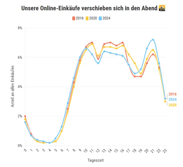 Der spätere Bestellschluss erklärt aber nicht, wieso die Kundschaft ausgerechnet in der Stunde von 21 bis 22 Uhr am meisten bestellt. Im Jahr 2024 gingen in dieser Zeit durchschnittlich 7,2 Prozent aller Produkte über den virtuellen Ladentisch.