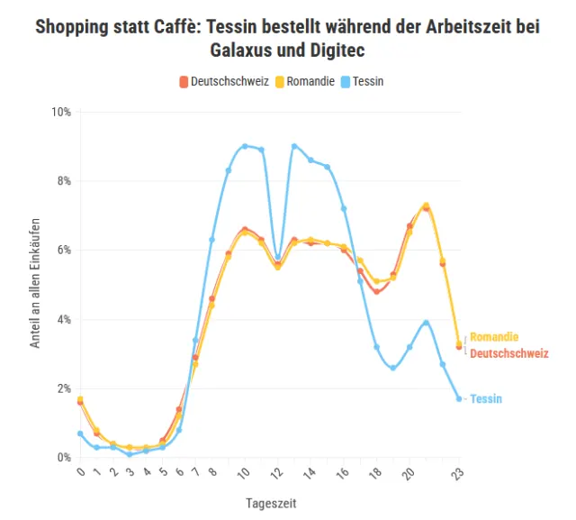 Neuerdings shoppt die Schweiz nach dem Abendessen häufiger bei Galaxus und Digitec als in den Stunden vor dem Mittag und vor Feierabend. Das hat viel mit dem heutigen Handykonsum zu tun – und mit dem auf 21 Uhr verlängerten Bestellschluss. Das Tessin ist aber anders.