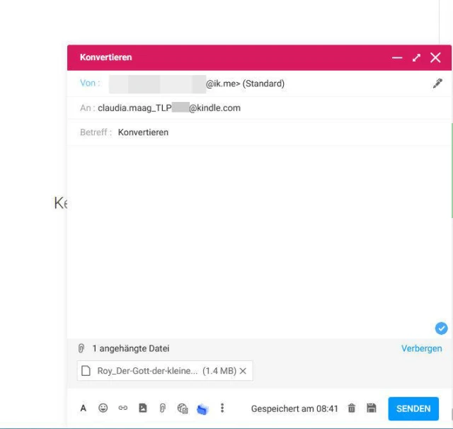 - Anschliessend erstellen Sie mit dieser Mailadresse eine Nachricht, die an die Kindle-Mailadresse geschickt wird. Hängen Sie das EPUB-Buch an die E-Mail an. Laut Amazon soll man im Betreff den Text Konvertieren eintippen.