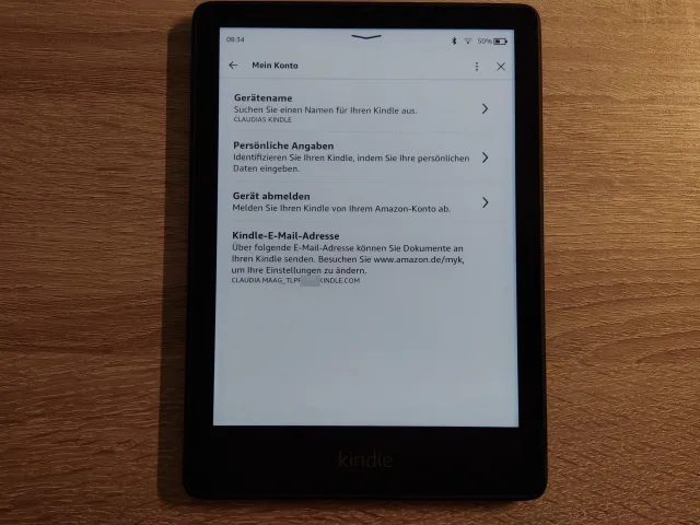 Unter «Mein Konto» finden Sie auf einem Kindle-Gerät Ihre Kindle-E-Mail-Adresse