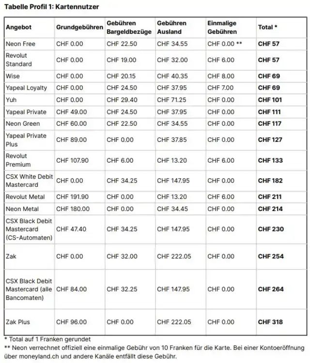 Für den ersten Vergleich hat moneyland.ch mit folgendem Profil gerechnet: Die Person kauft mit der Karte der Neobank (in der Regel handelt es sich um eine Debitkarte) in einem Jahr für 10’000 Franken in der Schweiz und für je umgerechnet 2000 Franken in Euro, US-Dollar und Thailändischen Baht im Ausland ein. Zudem bezieht die Person einmal an einem Schweizer Bancomaten und insgesamt sechsmal an ausländischen Bancomaten Bargeld.