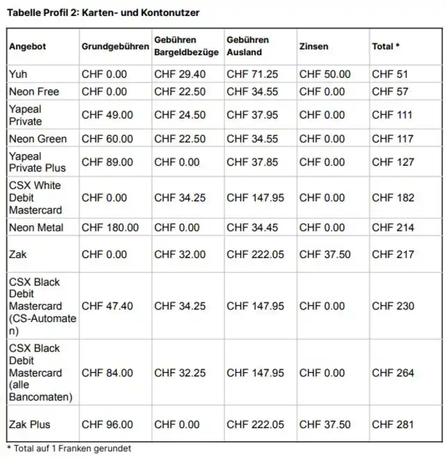 Es folgen knapp dahinter der ausländische Anbieter Wise mit 69 Franken und die Schweizer Neobank Yapeal mit dem Loyalty-Angebot mit Kosten von je 69 Franken. Am teuersten sind Zak Plus mit 318 Franken und CSX Black Debit Mastercard mit 264 Franken.