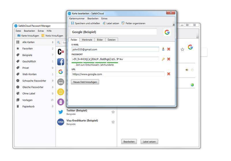 Dieses Feature hat durchaus auch eine erzieherische Funktion: So weist es bei sehr schwachen Passwörtern wie «123456» oder «Passwort» darauf hin, dass sie im Grunde «sofort» gecrackt werden können. Ist es schwach (acht Zeichen lang und bestehend aus einem gängigen Wort und einer Zahl) werden gut 37 Minuten veranschlagt. Erst bei 32-stelligen zufälligen Zeichenreihen aus Gross- und Kleinbuchstaben sowie aus Zahlen und Sonderzeichen geht SafeInCloud davon aus, dass Cracker mit heutigen Mitteln «Jahrhunderte» bräuchten, um das Kennwort herauszufinden.