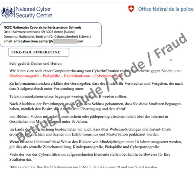 E-Mails, die angeblich von Behörden verschickt werden und die Empfängerinnen oder Empfänger einer Straftat im Zusammenhang mit (Kinder-)Pornografie bezichtigen, sind nicht neu. In der vergangenen Woche wurden solche Fake-Extortion-E-Mails wieder vermehrt beim Nationalen Zentrum für Cybersicherheit (NCSC) gemeldet. Es waren fast 40 Prozent (345) der eingegangenen Meldungen, die diesen Bereich betreffen. Für einen grossen Teil dieser E-Mails wurde als Absender jedoch nicht eine Strafverfolgungsbehörde verwendet, sondern das NCSC.