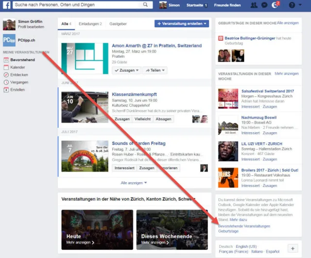 Melden Sie sich mit Ihren Zugangsdaten bei Facebook an, klicken Sie links auf Ihrer Statusseite auf Veranstaltungen.