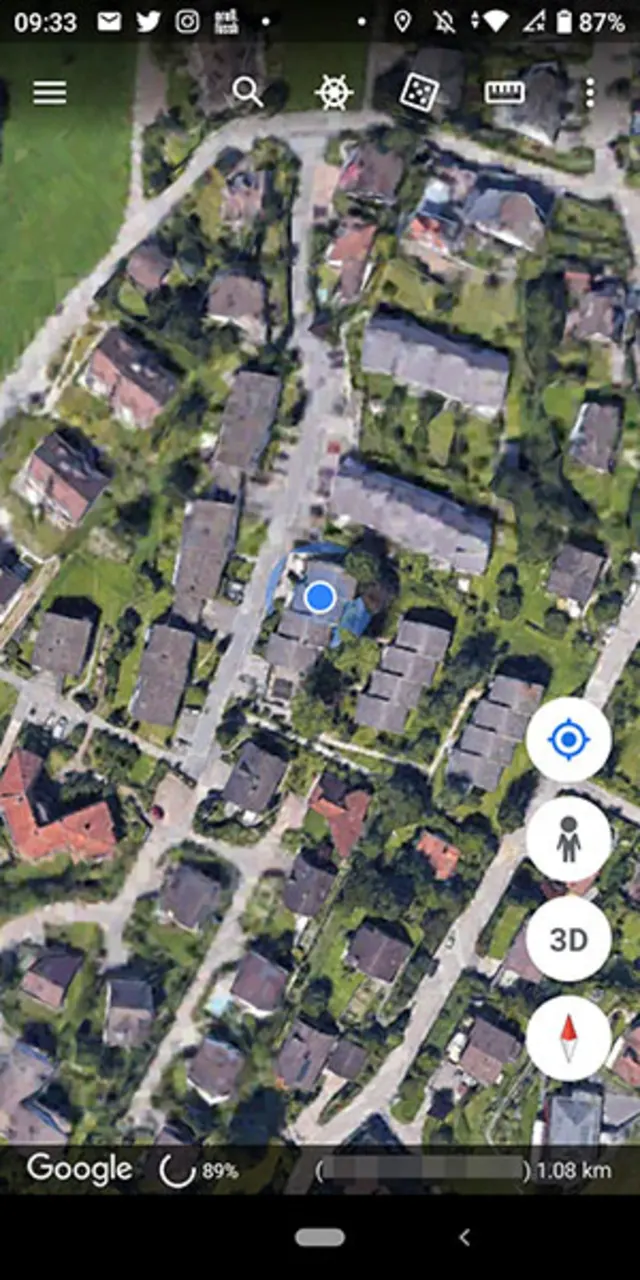 Um den blauen Punkt (My Location) zu sehen, tippen Sie in der App oder Webversion auf die Zu-meinem-Standort-Fliegen-Taste. Nachdem der digitale 3D-Globus zu Ihrem Standort herangezoomt hat, sehen Sie, wie von Google Maps gewohnt, Ihren Standort mit dem blauen Punkt angezeigt.