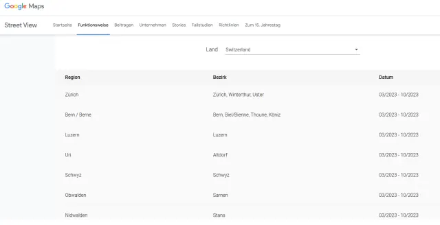 Google schickt seine Street-View-Autos unter anderem wieder auf Schweiz-Tour. Einen Auszug, wo diese Fahrzeuge bis Oktober 2023 unterwegs sind, sehen Sie unten im Screenshot. Beispielsweise sind die Street-View-Fahrzeuge ab März in Zürich/Winterthur/Uster, Bern, Luzern, Uri, Schwyz oder Ob- bzw. Nidwalden, Zug oder Fribourg unterwegs.
