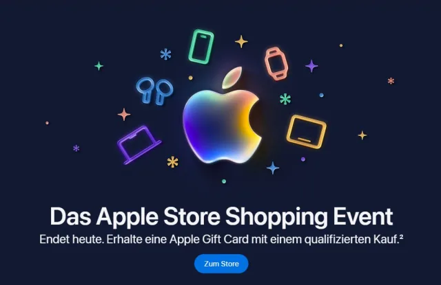 Das Apple Shopping Event läuft noch bis heute. Wer ein "qualifiziertes" Produkt bei Apple kauft, erhält eine Apple Gift Card für zukünftige Einkaufe zum Produkt dazu. Der Wert der Gift Card kann bis zu 200 Franken betragen, doch diese Summe gibt es nur für Käufe im höheren Preissegment. Bei den AirPods 4 gibt es zum Beispiel eine Gift Card im Wert von 20 Franken. Die vollen 200 Franken erhält man nur beim Kauf eines MacBook Pro. Die ganze Liste ist hier zu sehen: https://www.apple.com/ch-de/shop/gifts/shopping-event/terms-conditions