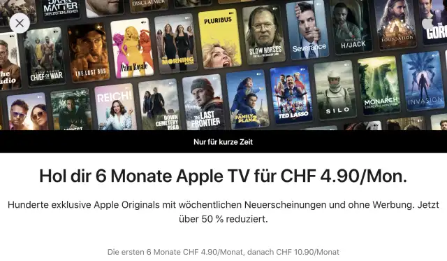 Aktuell gibt es auch bei Apple TV ein Sparangebot. Zunächst kann eine Woche kostenlos getestet werden, danach zahlt man für die ersten 6 Monat bloss 4.90 Franken pro Monat bevor der Preis dann auf monatlich 10.90 Franken steigt.