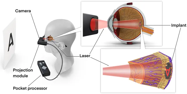 Eine an einer Spezialbrille angebrachte Kamera nimmt Bilder auf, etwa die Wörter in einem Buch. Diese werden mit unsichtbarem Nahinfrarotlicht auf das Implantat projiziert. Es wandelt das Licht in elektrische Pulse um, die zum Gehirn fliessen und dort als Wörter interpretiert werden – so, wie es mit den Signalen geschieht, die die natürlichen Fotorezeptoren liefern. Die Patienten können die Zoom- und Kontrasteinstellungen anpassen, um das funktionelle Sehvermögen zu verbessern.