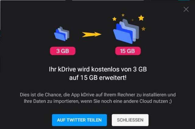 Quelle: Screenshot/PCtipp.chTipp: Wer bereits eine ik.me-Mailadresse hat und bisher nur 3 GB kDrive-Speicher besass: Loggen Sie sich in der Webversion ein und öffnen Sie die kDrive-Seite. Sie sollten automatisch ein Upgrade-Fenster sehen. Der Speicher wird kostenlos von 3 auf 15 GB erhöht.