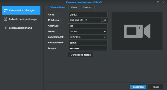 Klicken Sie auf Verbindung testen. Schlägt der Versuch wegen fehlerhafter Autorisierung fehl, müssen Sie überprüfen, mit welchen Benutzerdaten Sie normalerweise auf die IP-Kamera zugreifen. Die Benutzeroberfläche einer IP-Kamera lässt sich in der Regel ganz normal via Browser mit der ihr zugewiesenen IP-Adresse aufrufen.