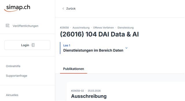 Fragen zur Ausschreibung sind an die offiziellen Kontaktadressen auf Simap.ch zu richten (26016) 104 DAI Data & AI