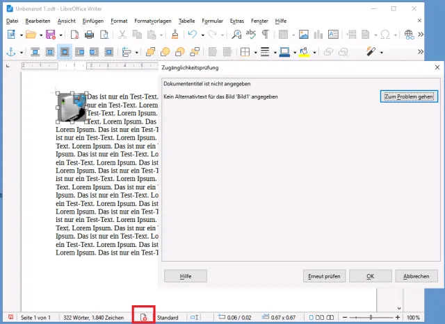 Die manuelle Zugänglichkeitsprüfung ist schon länger Teil von LibreOffice. Jetzt gibts auch ein Icon für die Statusleiste.