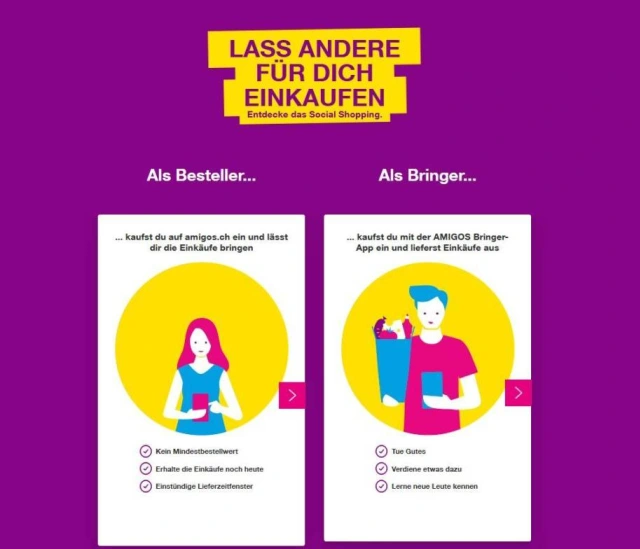 Jemand, der z.B. schlecht zu Fuss ist, konnte seine Einkaufsliste auf www.amigos.ch posten. Ein sogenannter Bringer nahm die Bestellung per Amigos-App an, kaufte die Artikel ein und brachte die Produkte dem Besteller nach Hause. Dieses Peer-to-Peer-Konzept sollte den sozialen Gedanken der Nachbarschaftshilfe im Fokus haben.