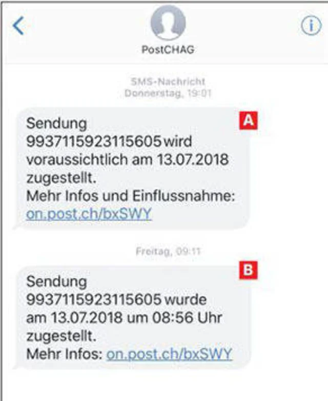 Quelle: PCtippMehr Informationen gibt es allerdings auch für den Empfänger, wenn er zuvor ein kostenloses Konto unter post.ch angelegt hat. Dann ist es möglich, sich via SMS über den Stand der Dinge informieren zu lassen. Das betrifft sowohl den Versand eines Pakets oder eines eingeschriebenen Briefs, A, als auch die erfolgreiche (oder erfolglose) Zustellung B. Allerdings gilt diese Benachrichtigung nicht für Standardsendungen, die im Ausland aufgegeben wurden.