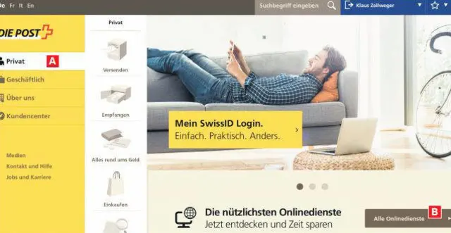Melden Sie sich mit Ihrem kostenlosen Konto rechts oben an oder erstellen Sie dort eines über den Befehl Neu registrieren. Klicken Sie links auf das Symbol Privat, A, und anschliessend auf die Schaltfläche Alle Onlinedienste B. Danach finden Sie eine Fülle an Funktionen – darunter auch eine, um die Post während einer bestimmten Zeit zurückzuhalten.