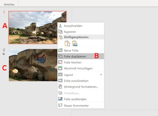 Fügen Sie zuerst das Bild (oder die Karte) auf einer Folie ein, so wie Sie diese in der Übersicht zeigen möchten (A). Klicken Sie danach mit der rechten Maustaste auf die Folie und wählen Sie im Kontextmenü «Folie duplizieren» (B). Danach vergrössern Sie das Bild auf der Folie so weit, bis es den Ausschnitt zeigt, auf den Sie heranzoomen möchten (C). Und so zoomen Sie von der ersten zur zweiten Folie: