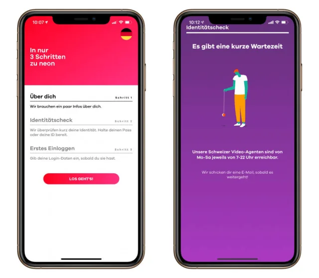 Bei Neon wird die Identität hingegen über einen Videochat durchgeführt. Das dürfte nicht nach jedermanns Geschmack sein. Es kommt aber noch besser: Dieser Chat wird von Intrum durchgeführt. (Machen Sie sich keine Sorgen, wenn sich jetzt Ihre Eingeweide verkrampfen – das ist in der Schweiz eine völlig normale Reaktion und zeigt, dass Ihre Instinkte hellwach sind.) Ich wollte die Anmeldung am Pfingstmontag durchführen, was scheiterte. Versuchen Sie es auch nicht am Sonntag, am frühen Morgen oder am späten Abend.