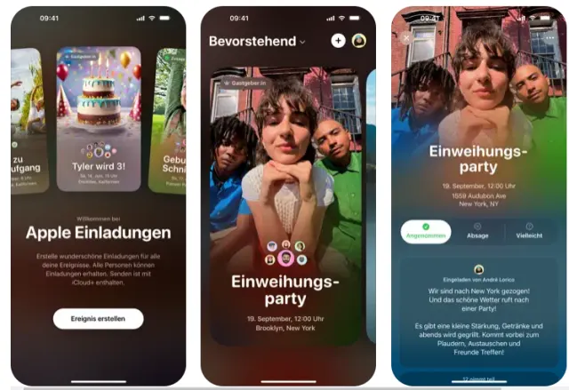Mit der neuen App können Nutzer individuelle Einladungen erstellen, um Freunde und Familie zu jedem Anlass zusammenzubringen. Nur iCloud+ Abonnenten können Einladungen erstellen, aber jeder kann zu- oder absagen, unabhängig davon, ob man über einen Apple Account oder ein Apple Gerät verfügt.