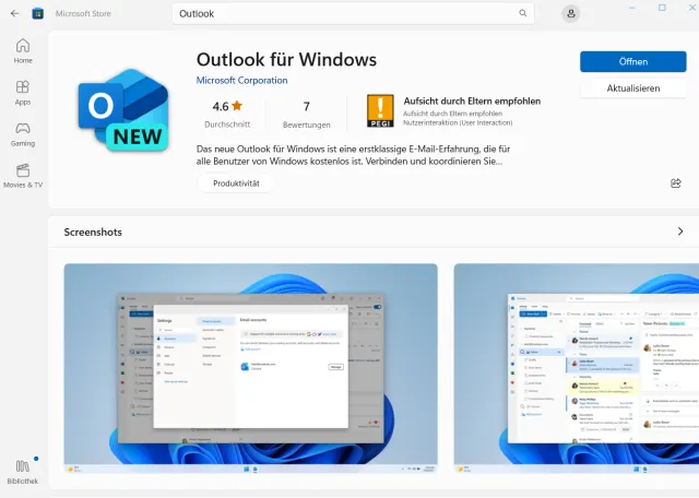 - Suchen Sie im Microsoft Store nach Outlook für Windows. Wenn dies bereits installiert ist, sehen Sie dort unterhalb von Öffnen den Button Aktualisieren.