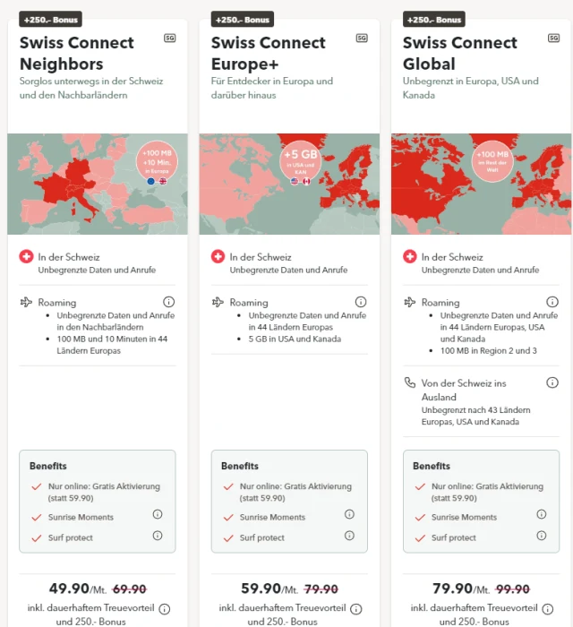 Sunrise inkludiert gemäss eigenen Angaben als einzige Anbieterin in der Schweiz bei allen Swiss Connect Mobile Abos ein Roaming-Guthaben. Wird ein Abo gewählt, das limitiertes Roaming beinhaltet, stehen nach Verbrauch der Inklusivleistungen die bisherigen Roaming-Optionen für die weitere Nutzung zur Verfügung.