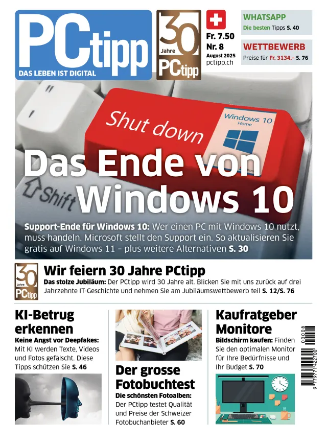 Ab dem 25. Juli 2025 wird das neue PCtipp-Magazin 8/2025 für Abonnentinnen und Abonnenten sowie am Kiosk erhältlich sein. Es verspricht eine Fülle von spannenden Themen für alle Tech-Begeisterten. Unter anderem finden Sie folgende Praxistipps, Workshops und Kaufberatungen im neusten PCtipp: