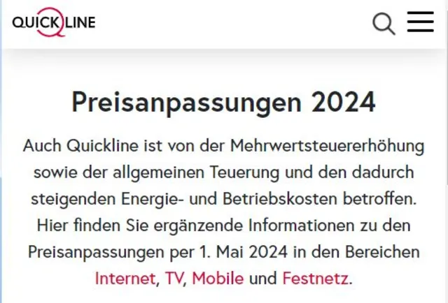 Quickline erhöht den Preis beim aktuellen Internet-Abo S
