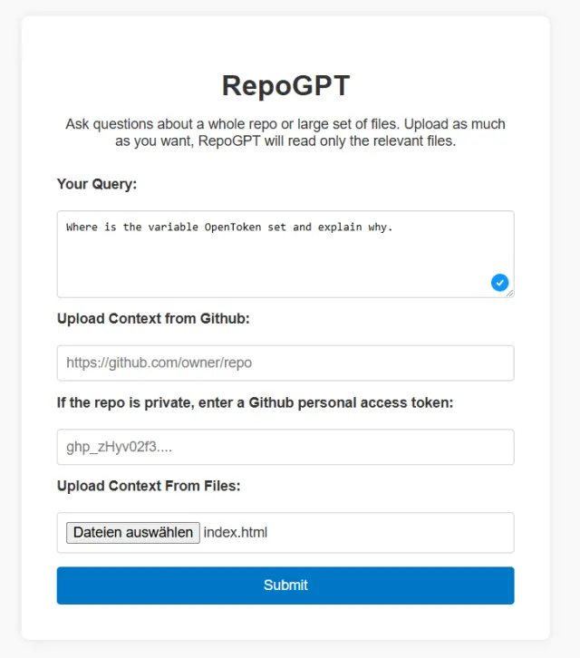 Die Nutzung von RepoGPT ist denkbar einfach: Um das Tool zu integrieren, müssen Entwickler lediglich das Repository klonen, ihren OPENAI_API_KEY in der index.html-Datei angeben und die verwendbaren Dateierweiterungen anpassen. Der letzte Schritt besteht darin, die index.html-Datei in einem Webbrowser zu öffnen. Das Tool läuft - bis auf die Nachfrage bei OpenAI - lokal.