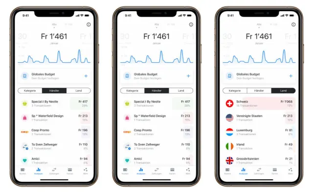 Tippen Sie den Bereich «Analysen» an und sehen Sie, wo Ihr Geld geblieben ist. Dabei unterteilt die App automatisch in «Kategorien» (etwa Restaurants), Händler (Migros, Google etc.) und Länder. Wischen Sie über dem Frankenbetrag nach links oder rechts, um durch die Monate zu blättern. Unter «Länder» sehen Sie jedoch nicht zwingend die Länder, die Sie bereist haben, denn Netflix wird zum Beispiel automatisch den Niederlanden zugerechnet, weil der Dienst dort in Europa angesiedelt ist.