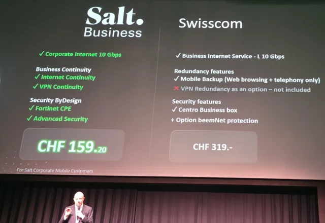 Zur Konkurrenz: In der Wettbewerbslandschaft trifft Salt nun, wie bereits angedeutet, auf etablierte Schwergewichte wie die Swisscom und Sunrise. Diese Konkurrenten beherrschen seit Jahrzehnten den Markt für Firmenanschlüsse und verfügen über sehr dichte Infrastrukturen. Speziell Swisscom punktet oft über ihre umfassenden Servicepakete und die langjährige Erfahrung in diesem IT-Segment. Welche Hebel jetzt Salt ausspielt, um diese Beziehungen aufzubrechen? Mithilfe einer sehr aggressiven Preispolitik. Zumindest gibt ihr Chef dieses Kommando bei der Lancierung im Aura-Saal bekannt. Dazu wurde eine grosse Folie an die Leinwand geworfen, in der man gegenüber einem ähnlichen Swisscom-Angebot um 50 Prozent günstiger sei (siehe Bild unten). Aber auch technologisch lässt sich Salt Business nicht zweimal bitten: So hat man bei der reinen Bandbreite ebenso die Nase vorn. Die Konkurrenz bietet zwar ebenfalls schnelle Glasfaseranschlüsse an, doch die Kombination aus 40 Gigabit und den angebotenen Konditionen ist im Konkurrenzkampf um die Schweizer KMU ein deutlicher Fingerzeig.