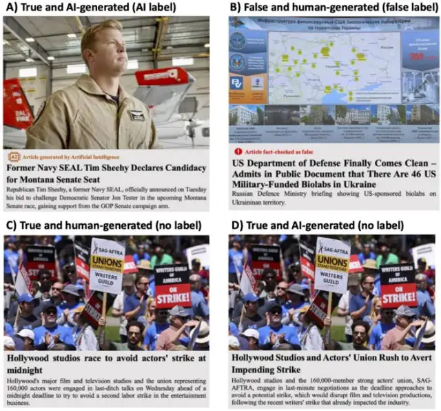 In der ersten Studie wurden die Teilnehmer zufällig einer der folgenden Bedingungen zugeordnet: Keine Schlagzeile war als KI-generiert gekennzeichnet; KI-generierte Schlagzeilen waren als KI gekennzeichnet; menschlich generierte Schlagzeilen waren als KI gekennzeichnet; und falsche Schlagzeilen waren als falsch gekennzeichnet.