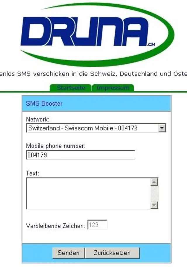 Die Dienstleistung Druna.ch hat ihren Betrieb aufgenommen. Über die Internetseite können SMS gratis und ohne Registrierung in die Schweiz sowie in die Nachbarländer Österreich und Deutschland versendet werden. Dafür muss auf der Website lediglich das gewünschte Netz ausgewählt und die jeweilige Empfängernummer sowie der betreffende Text der Kurznachricht eingegeben werden. Das Angebot ist kostenlos und finanziert sich dem Betreiber zufolge durch Spenden und Werbung.