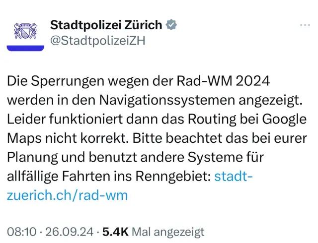 Stadtpolizei Zürich rät bei Rad-WM von Google Maps ab