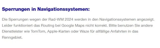 Wegen der Rad-Weltmeisterschaft sind aktuell in Zürich viele Strassen gesperrt. Leider scheint das Re-Routing bei Google Maps nicht zu klappen.