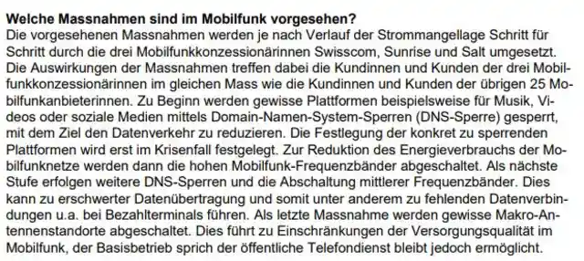 Der in die Vernehmlassung geschickte Verordnungsentwurf sieht bei Kontingentierungen Einschränkungen des Stromverbrauchs im Mobilfunk vor. Verbrauchsstätten, die der Aufrechterhaltung des Festnetzes und des Mobilfunks dienen, werden von der Kontingentierung ausgenommen. Solche Ausnahmen werden nur gewährt, wenn branchenspezifische Lösungen zur Reduktion des Stromverbrauchs vorliegen.