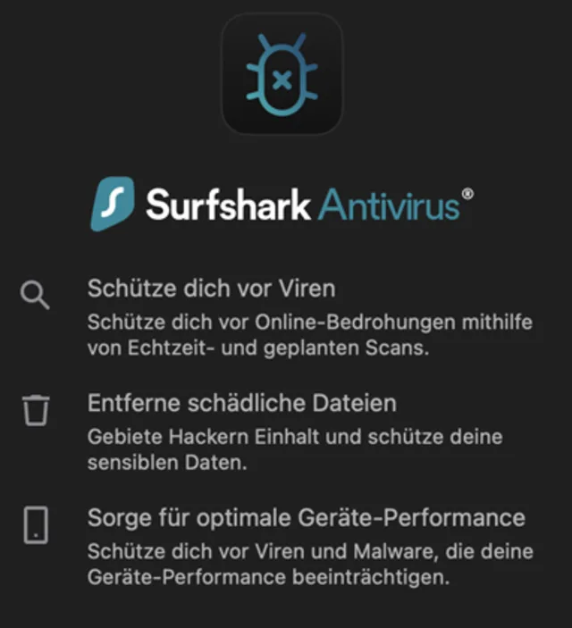 Vorteile: Surfshark Antivirus bietet Ihnen eine zusätzliche Sicherheitsebene, die Sie vor Bedrohungen im Internet schützt. Sie benötigen also kein zusätzliches Antivirusprogramm.