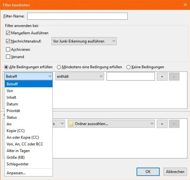 Quelle: PCtipp.chWie jedes richtige Mailprogramm unterstützt auch Thunderbird das Erzeugen von Filter- bzw. Sortierregeln. Dies finden Sie normalerweise unter Hamburger-Menü/Filter. Sie können Nachrichten nach allerlei Kriterien verarbeiten lassen. Die Liste der möglichen Bedingungen ist lang, Bild 6. Die vorhandenen Aktionen lassen sich ebenfalls sehen, Sie können aufgrund der gesetzten Kriterien automatisch bestimmte Schlagwörter setzen, Nachrichten löschen, verschieben oder weiterleiten.